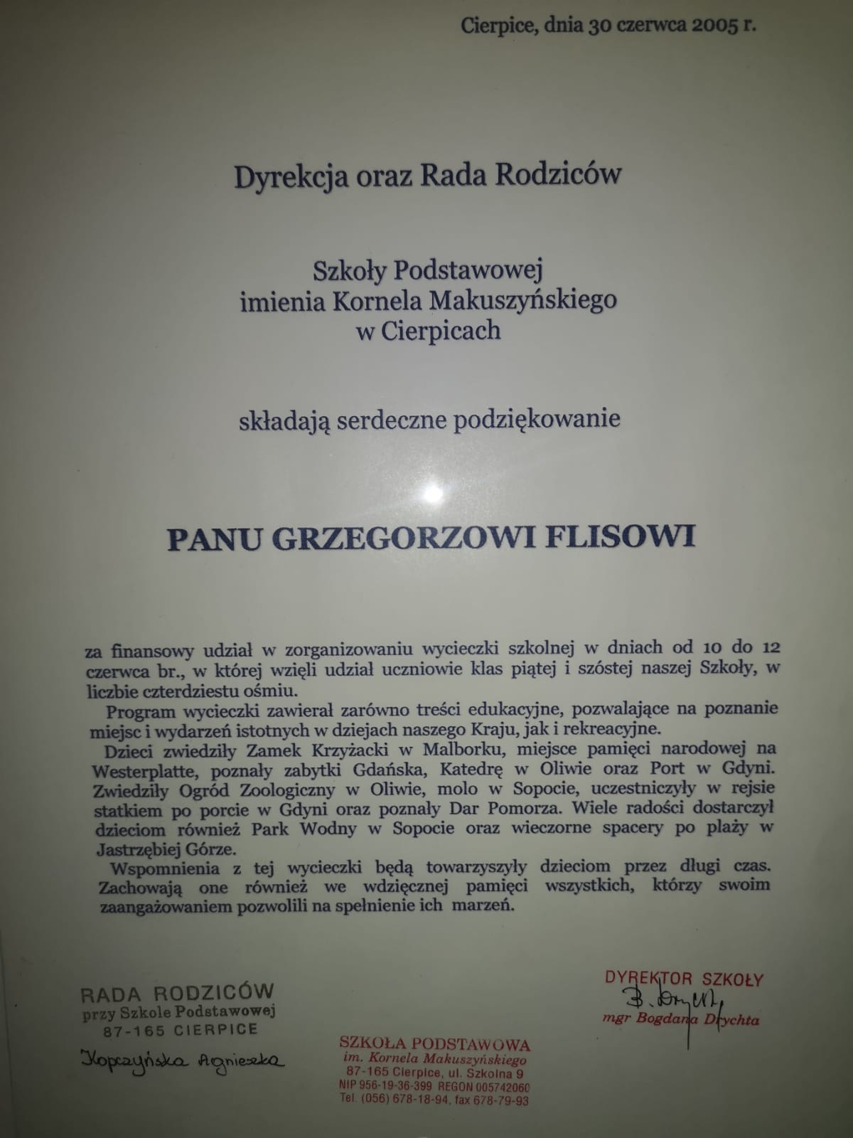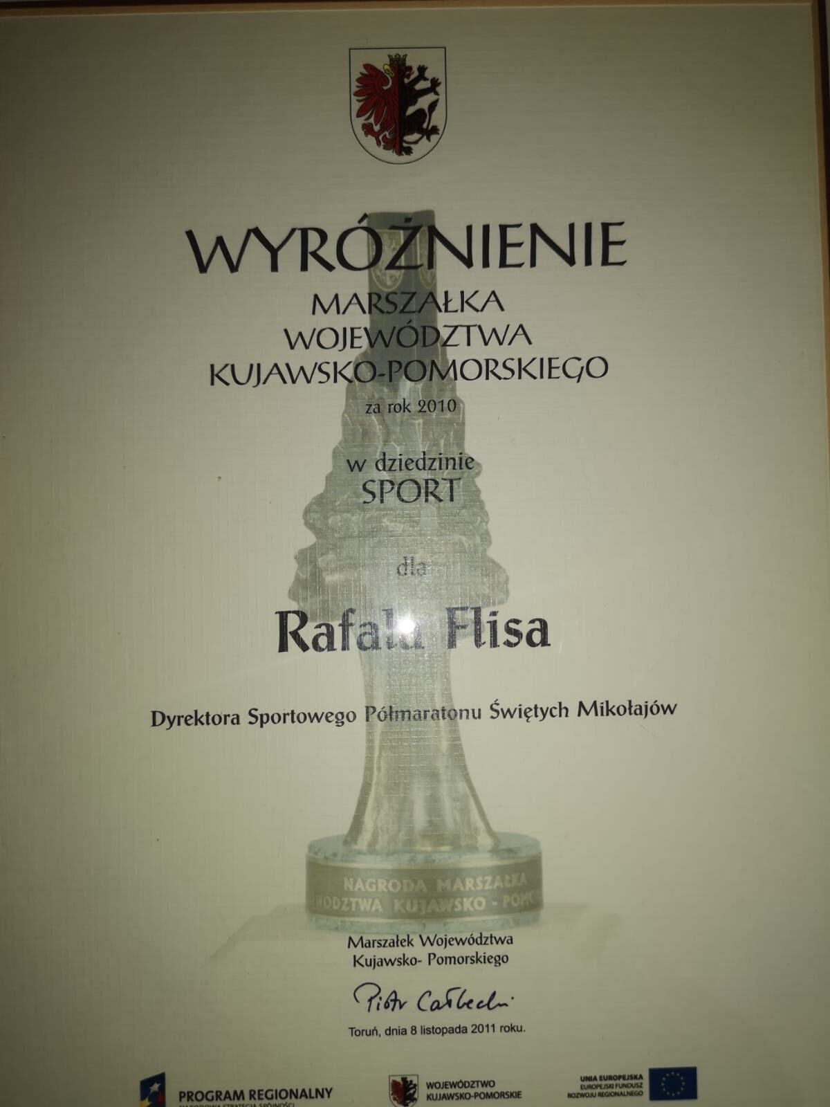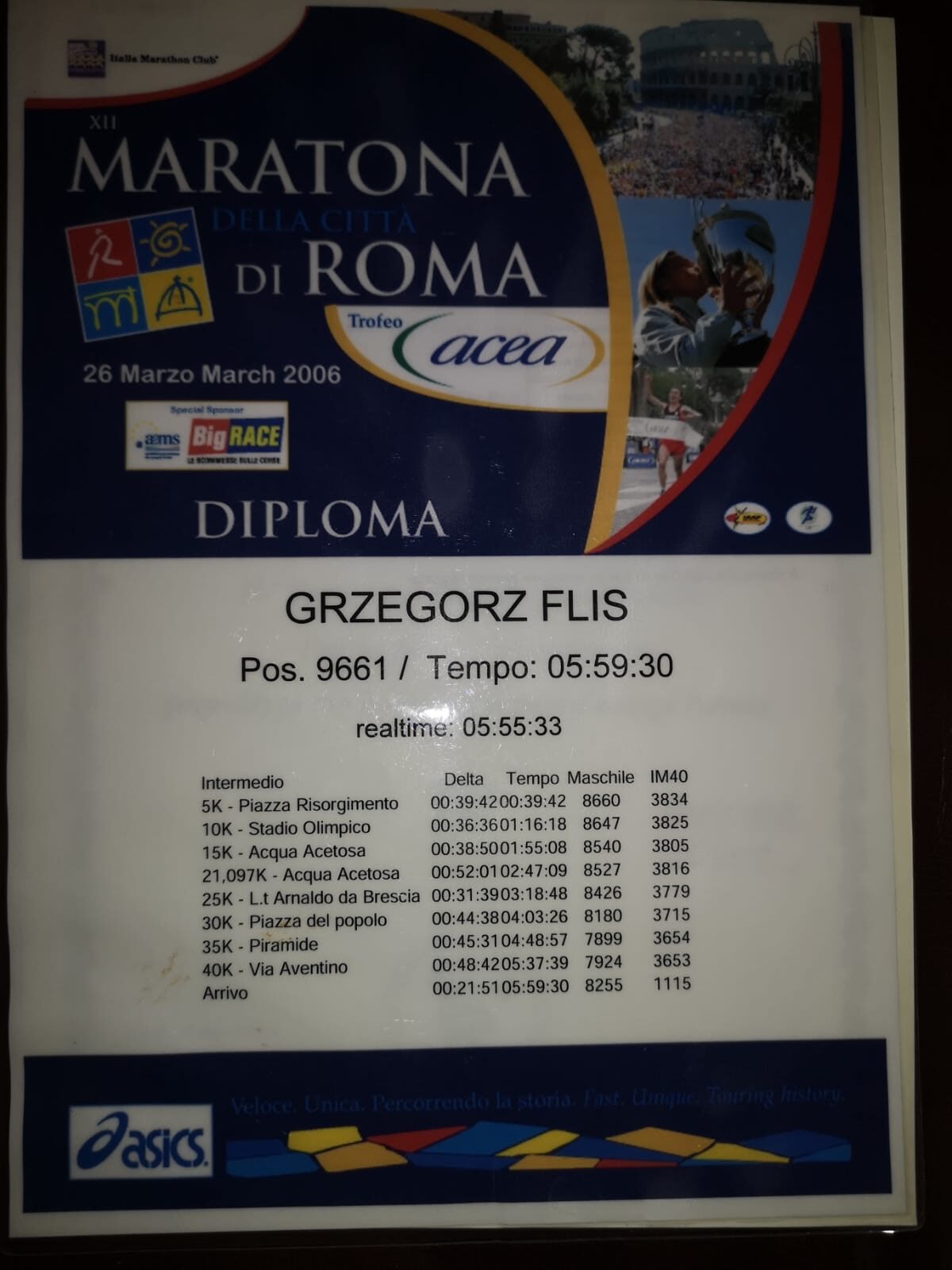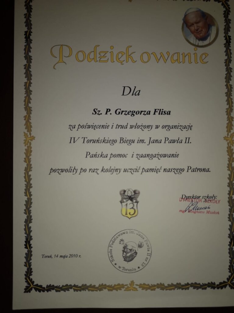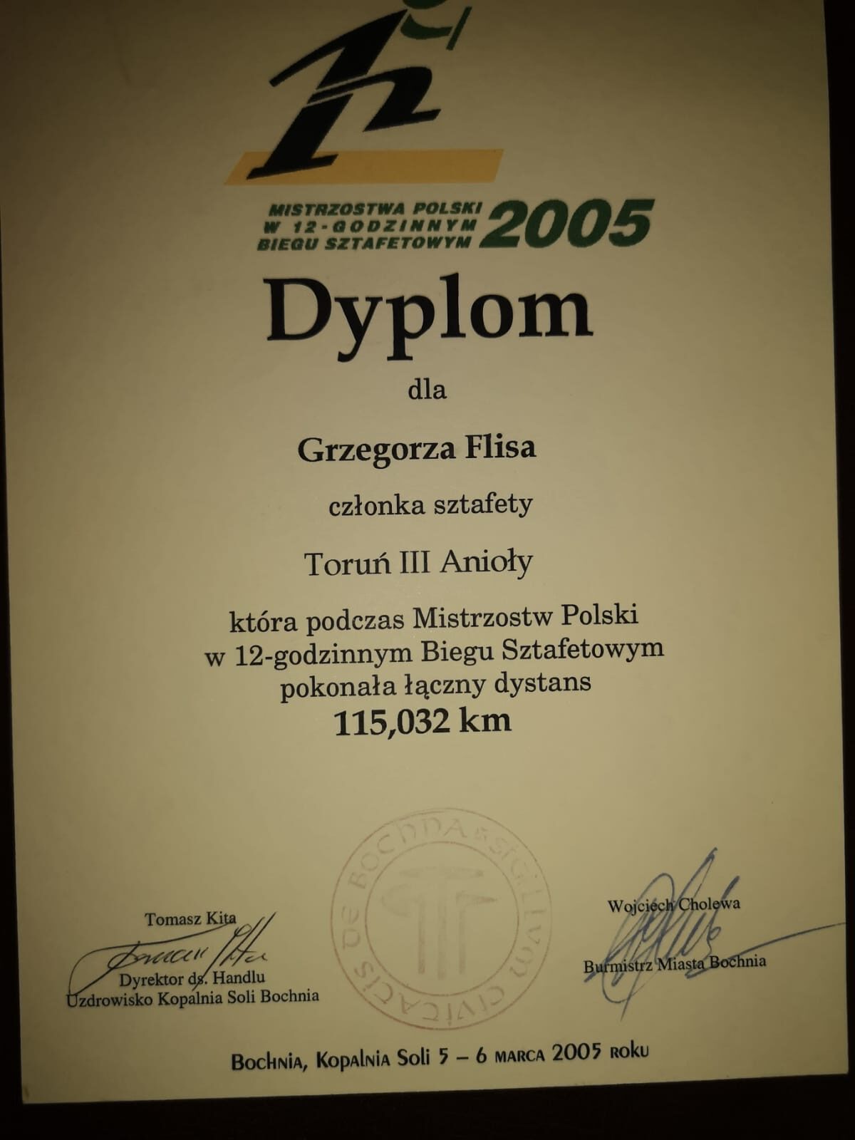 Wreszcie trzeba wspomnieć, że Grzegorz Krzysztof Flis nie tylko organizuje biegi ale sam biega ukończył trzy maratony/Poznań, Toruń, Rzym/ , wiele biegów na 10 km – między innymi / Limasol – Cypr, Swindow – Wielka Brytania, Leida – Holandia / oraz biegów na 5 km.